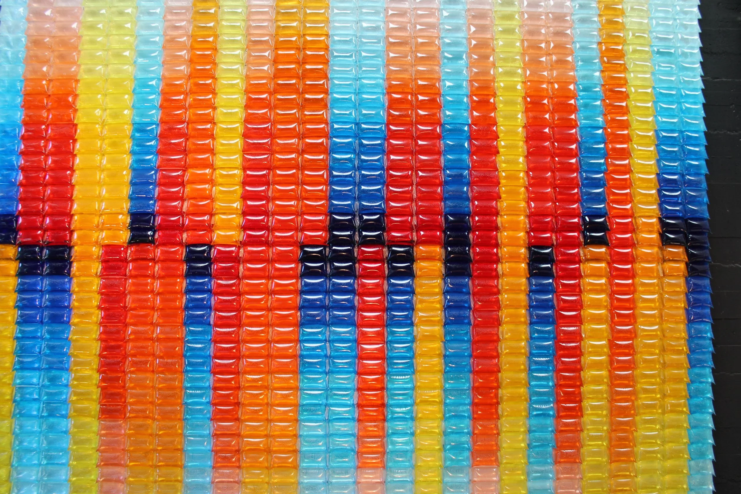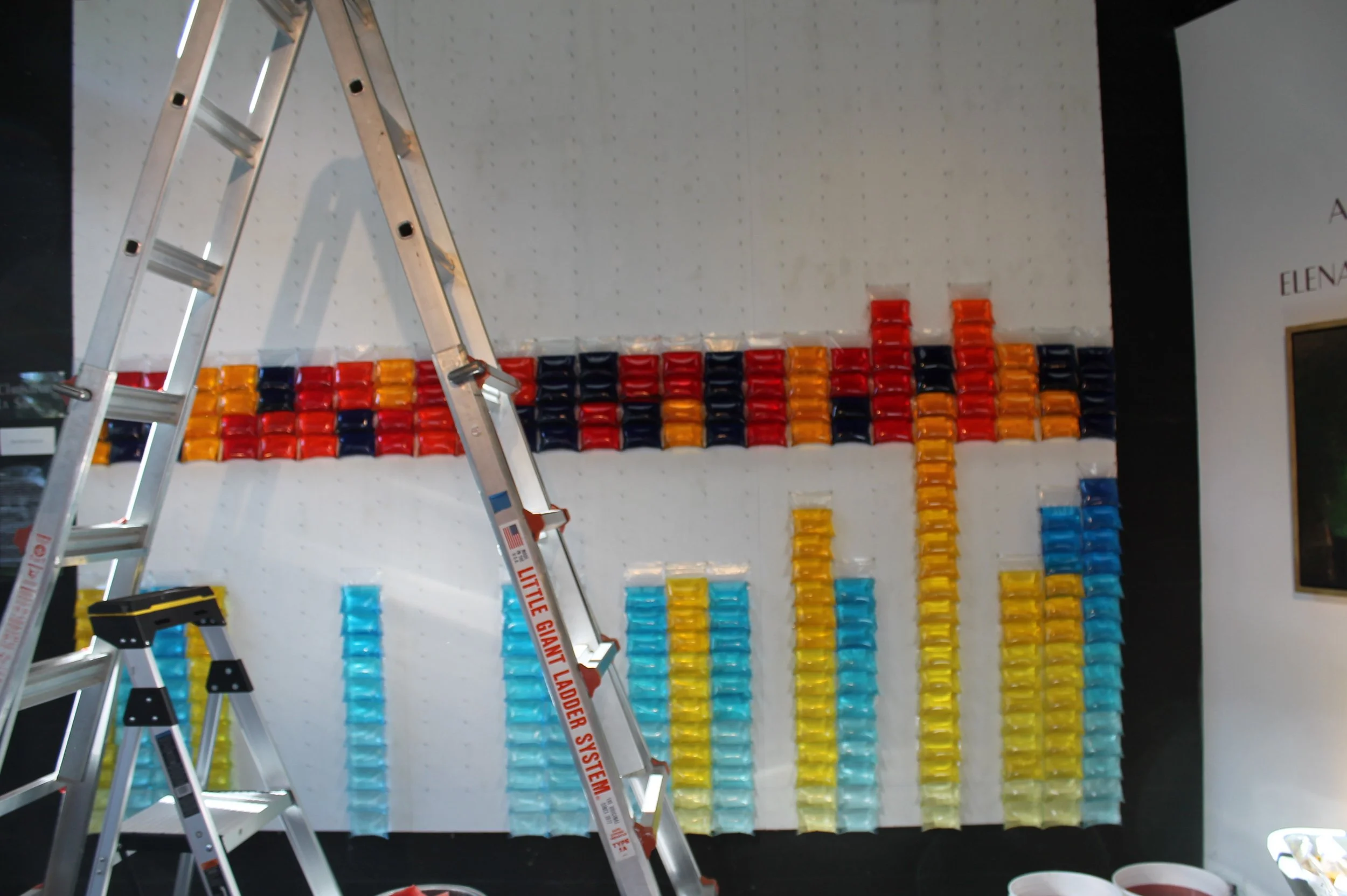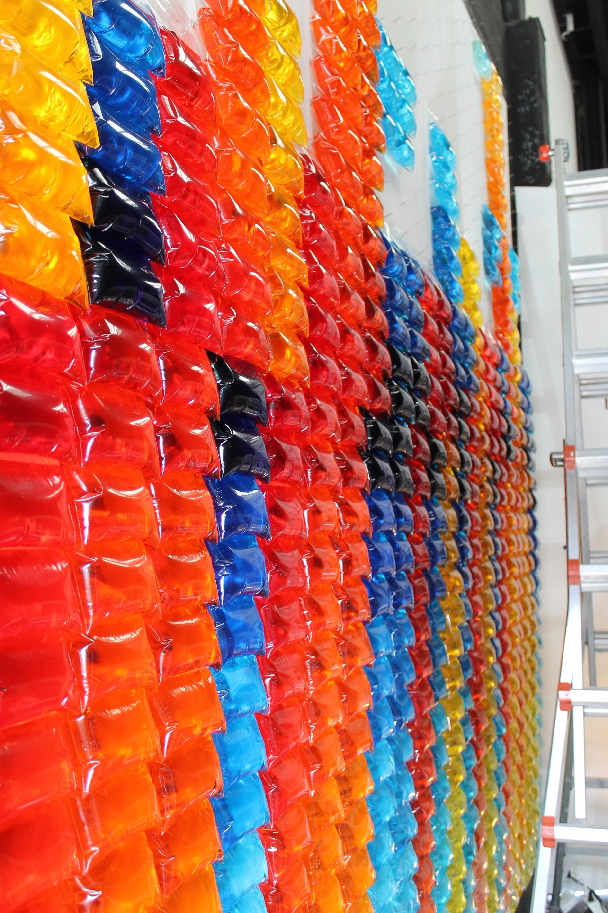 The color gradient shows the pattern of the proteins in the gene-A,C,G,T and the remarkable similarity between the two sequences. By using transparent dyes suspended in water the piece covers a much larger range of variation as light passes through the bags. The dyes are food safe, non toxic pigments that can be poured into the water table or Bay without causing harm to plants or animals.